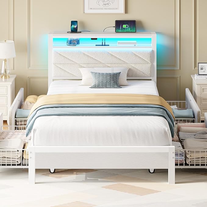Seventable Twin Bed Frame with 4 Storage Drawers, Charging Station & LED Lights, Upholstered Headboard with 2-Tier Shelves, Metal Platform Bed, No Box Spring Needed, Noise-Free, White