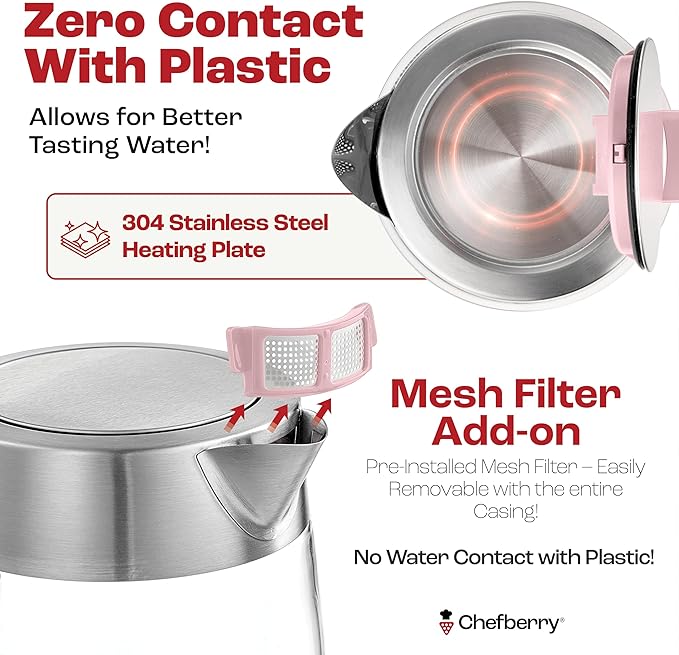 - No Plastic - 100% stainless steel water-contact paths: no plastic in the spout or filter, ensuring pure taste and safe heating, Includes a removable plastic mesh Filter