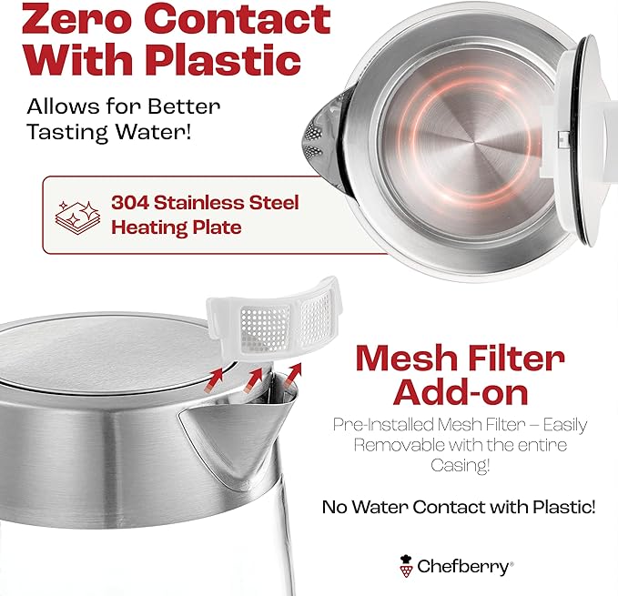 - No Plastic - 100% stainless steel water-contact paths: no plastic in the spout or filter, ensuring pure taste and safe heating, Includes a removable plastic mesh Filter