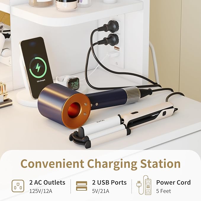 - 🔋 Hassle-Free Charging Hub Plug in curling wands + phone** simultaneously! 2 AC outlets + 2 USB ports (5V/2.4A) hidden behind easy-access panel. Selfie-ready after makeup? Yes!