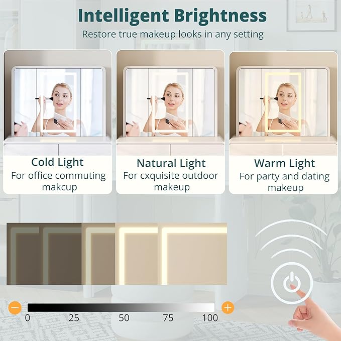 - Organized Storage System: Two wide drawers store everyday bottles and jars, while nine hidden storage compartments neatly house your secret beauty products. This keeps your vanity desk clean and tidy, giving it a soothing feel, while also protecting your little secrets. Every time you use your vanity with mirror and lights, it's like opening a neat "beauty diary"