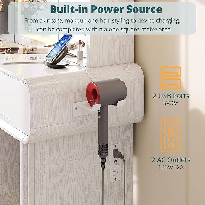 - Built-in Beauty Power Station: This vanity desk is equipped with two power outlets and two USB ports, allowing for simultaneous power supply to multiple devices. The side hair dryer holder makes it easy to put and take out the hair dryer, eliminating the need to go back and forth between the bedroom and the vanity to find a power source. This ensures a smooth and uninterrupted makeup routine, allowing you to maintain a composed demeanor even when commuting