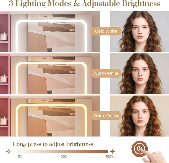 - Large LED Lighted Vanity Desk - Features cold white, warm white, and warm yellow modes. Adjust brightness by long-pressing the touch screen for different scenes and makeup needs (foundation, contouring, etc.). Enhances charm and style. Perfect as a vanity desk with mirror and lights for your beauty routine