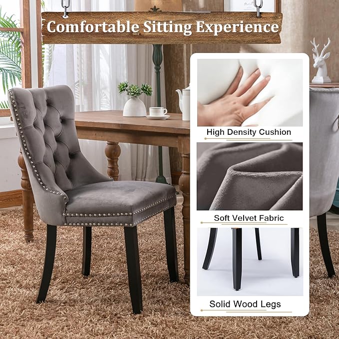- ➤【Comfy Velvet Upholstered Dining Chairs】- Tufted high backrest have a strong comfortable back support. Plenty decorative rivet inset around cushion and back make this chair looks noble and elegant. High density cushion provide a comfortable seating experience. The chair's frame and legs are made of solid wood with enough security to hold up to 250 pounds.
