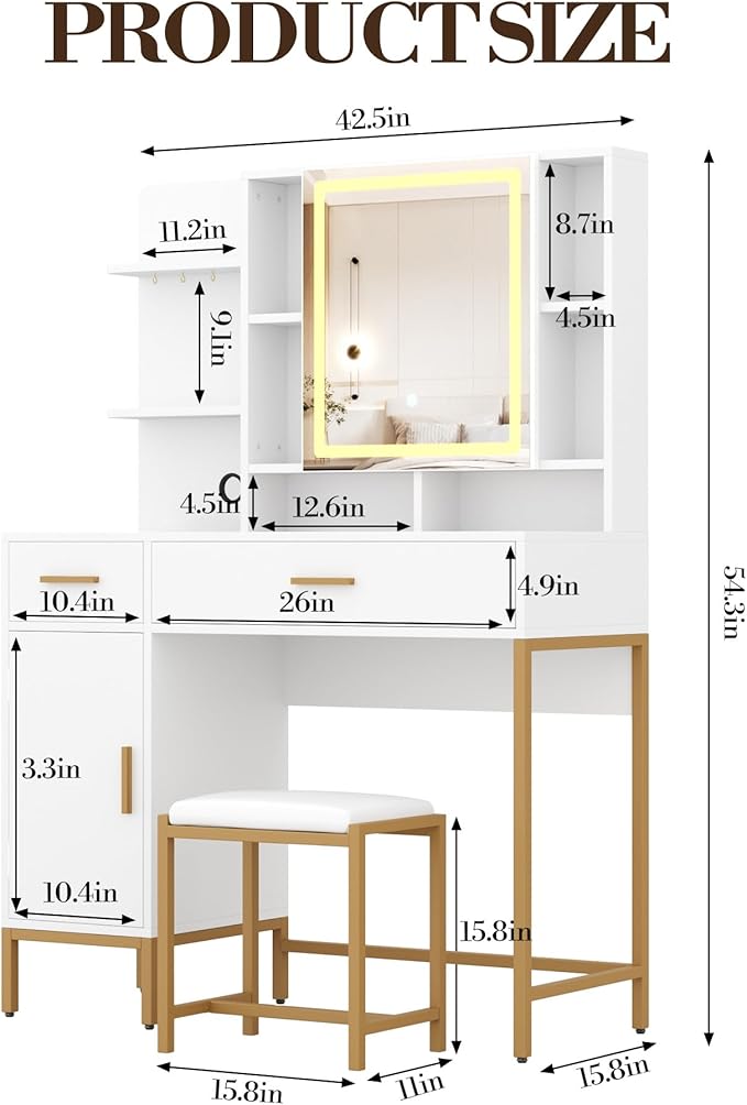 IDEALHOUSE Vanity Desk with Mirror and Lights, 42.5" Makeup Vanity Set with Stool, Makeup Table with Mirror Cabinet and Chair, Drawers & Shelves, Dressing Table with Outlet for Bedroom, White