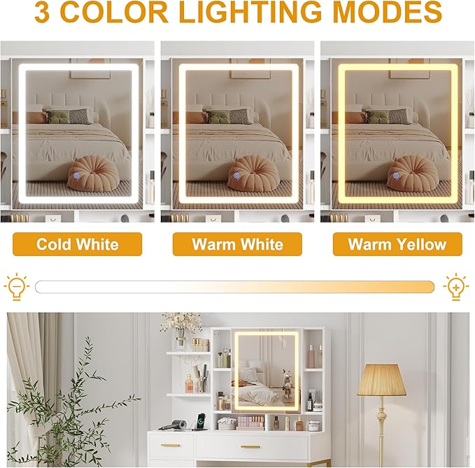 - Adjustable Lighted Mirror: The mirror features three lighting modes—warm yellow, warm white, and cool white—with touch-sensitive controls for adjusting brightness levels to suit different makeup and styling needs.