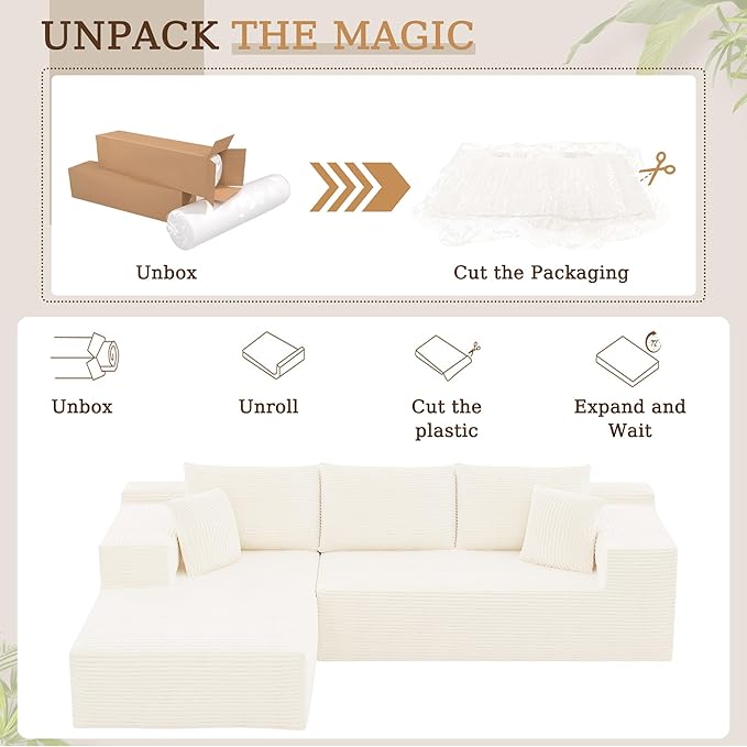 - No Assembly Required: This boneless couch is easy set up, just cut the plastic cover, it expands quickly a fluffy couch. NOTE: It will need 2-3 days to fully form. Tip: Pat the cushions and pillows