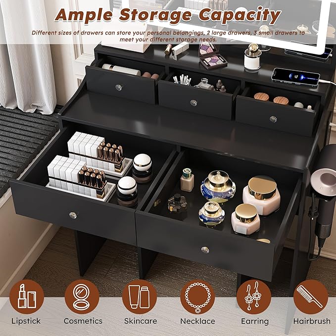 - 【 Spacious Storage 】With dimensions of 31.5”W x 15.7”D x 53.15”H, this cute vanity offers ample storage for all your beauty essentials. It features 2 large drawers and 3 small drawers,everything has a dedicated spot—say goodbye to messy countertops!