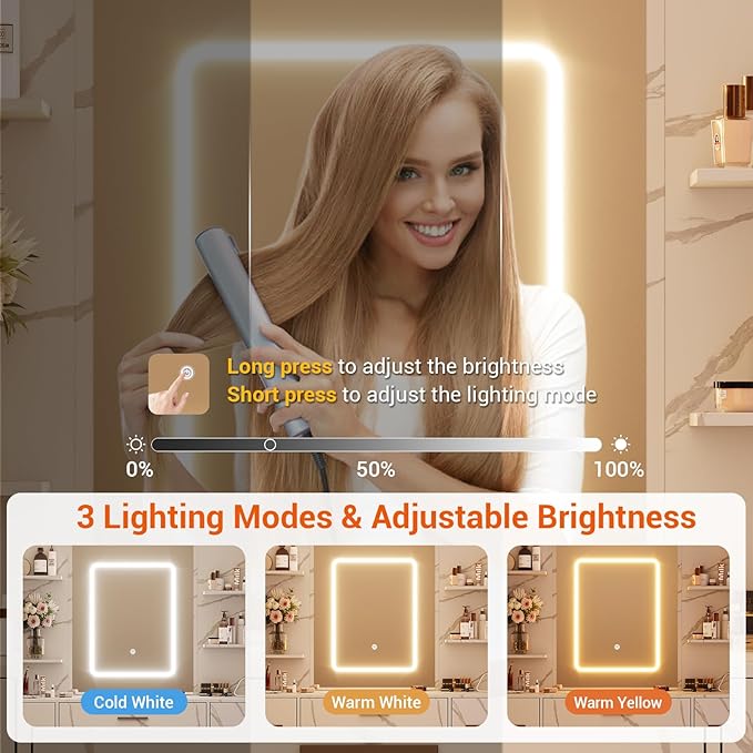 - Smart LED Lighting with Touch Control & 3 Color Modes: Transform your space with a touch. This vanity features integrated, touch-controlled LED lights that allow you to effortlessly control your lighting and ambiance. A gentle long press adjusts brightness, while a simple tap cycles through warm, cool, and daylight tones—creating the perfect light for home makeup application, salon styling, or professional live streaming.
