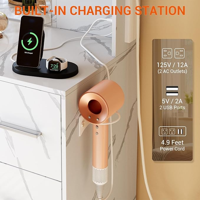 - Complete Charging & Beauty Station: Never run out of power mid-styling. Equipped with 2 AC outlets and 2 USB ports, this vanity is a complete charging and beauty station. Safely plug in your curling iron or hair dryer while charging phones and tablets. The integrated hair dryer rack keeps your favorite tool within reach, combining convenience and functionality seamlessly.