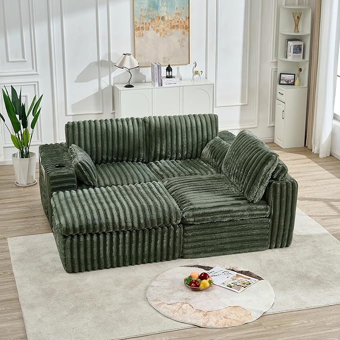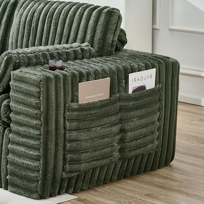 KEIKI 113'' Oversized Ribbed Chenille Modular Sectional with Ottoman, Deep-Seat Cloud Sofa with Cup Holder & Storage Pouch, Indoor Chaise Lounge Boneless Chair for Office, Studio & Creative Workspaces