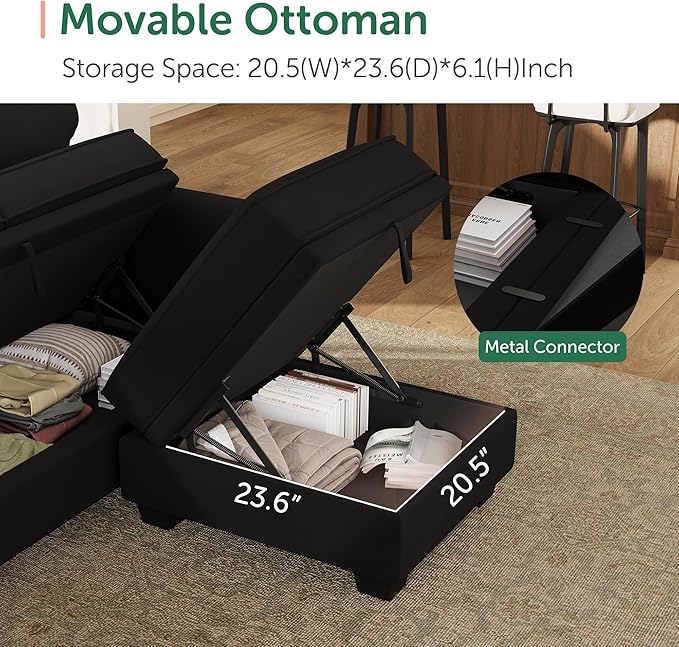 - Spacious Sofa:This Storage sectional sofa is made with a sturdy solid wood frame and cushions filled with high-density sponge and wrapped in 100% Velvet fabric