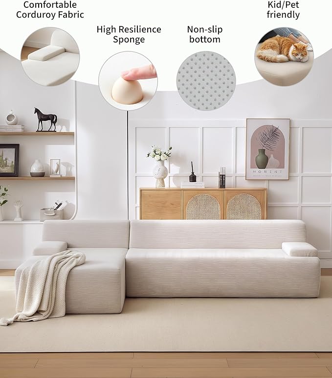 - Soft Corduroy Fabric: Sink into the cloud-like comfort of our boneless couch, upholstered in premium corduroy fabric. This sectional delivers softness and support, contouring to your body for ultimate relaxation. While perfect for households with pets—thanks to hair-resistant fabric that cleans easily with a lint roller—its luxury lies in how it cradles you in plush, stress-free delight