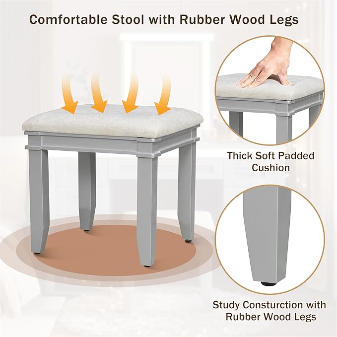 - [Comfort Stool & Space-Saving] The set includes 1 soft cushioned stool with an extra-wide 16.5″ × 16.5″ seat for enhanced comfort. Its sturdy solid rubber wood legs ensure durability, and the stool fits neatly under the vanity desk with mirror and lights when not in use, saving space and maintaining a clean, organized bedroom appearance.
