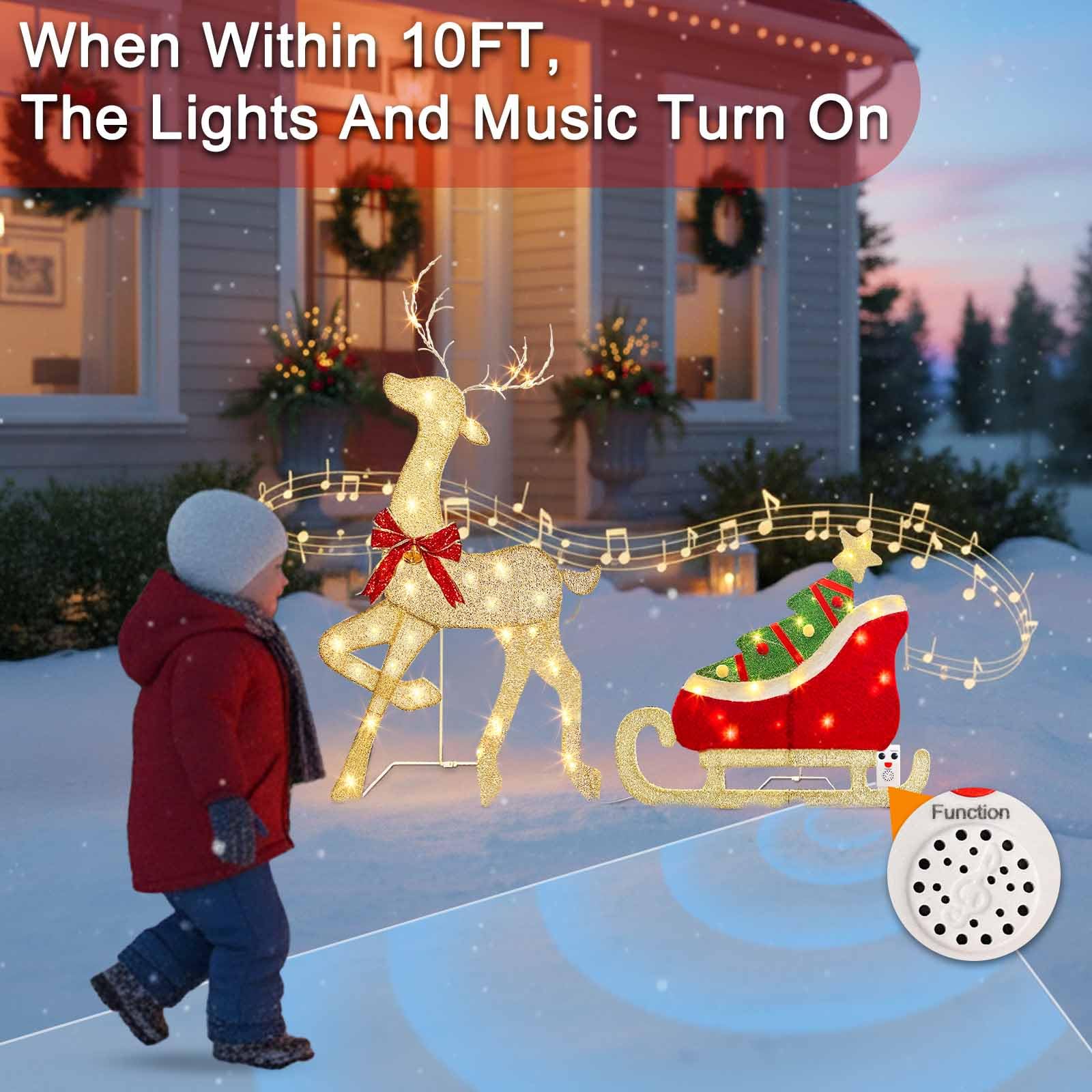 - 【 Christmas Gifts 】Whether for a family gathering or a commercial setting, indoors or outdoors, this musical reindeer with sleigh is the perfect Christmas decoration. It's suitable for gardens, porches, balconies, living rooms, offices, restaurants, and more. The exquisite gift packaging and easy assembly make it an ideal Christmas gift for friends and family.