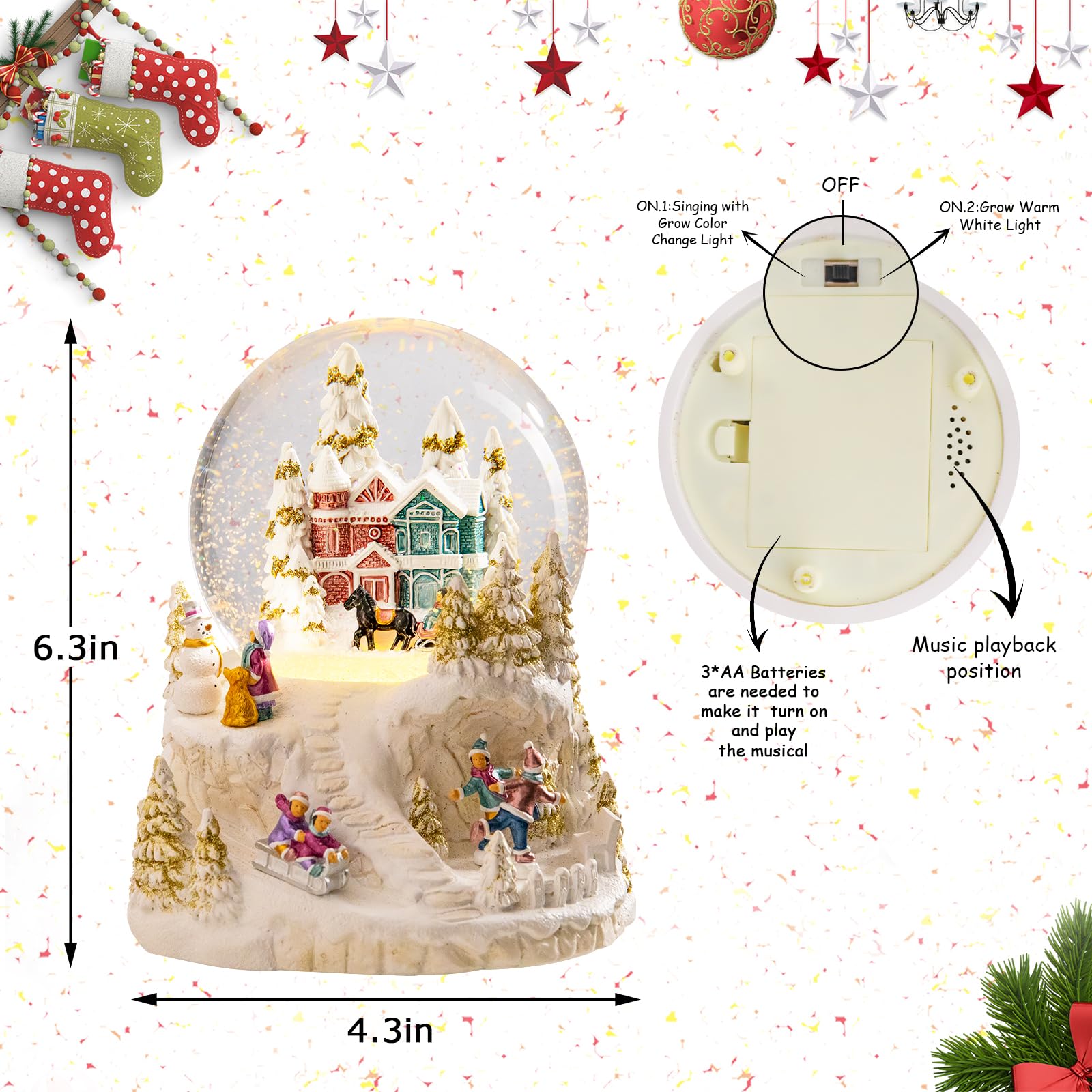 - 【Musical Snow Globe】Beautiful Christmas snow globe is equipped with music box and eight Christmas carols to plays the cheerful tune, adding with color changing LED lights to create a festival and warm scene of Christmas atmosphere