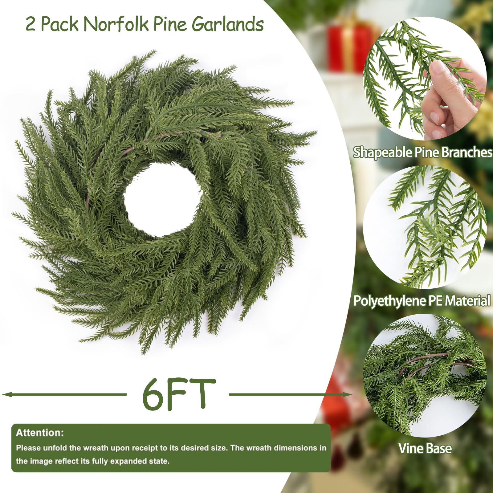 - Generous 6FT Length and 2-Pack Value: Each package includes two 6-foot Norfolk pine garlands, giving you a total of 12 feet of luxurious greenery garland. The generous length allows for versatile arrangements, Ideal for enhancing indoor and outdoor Christmas decorations