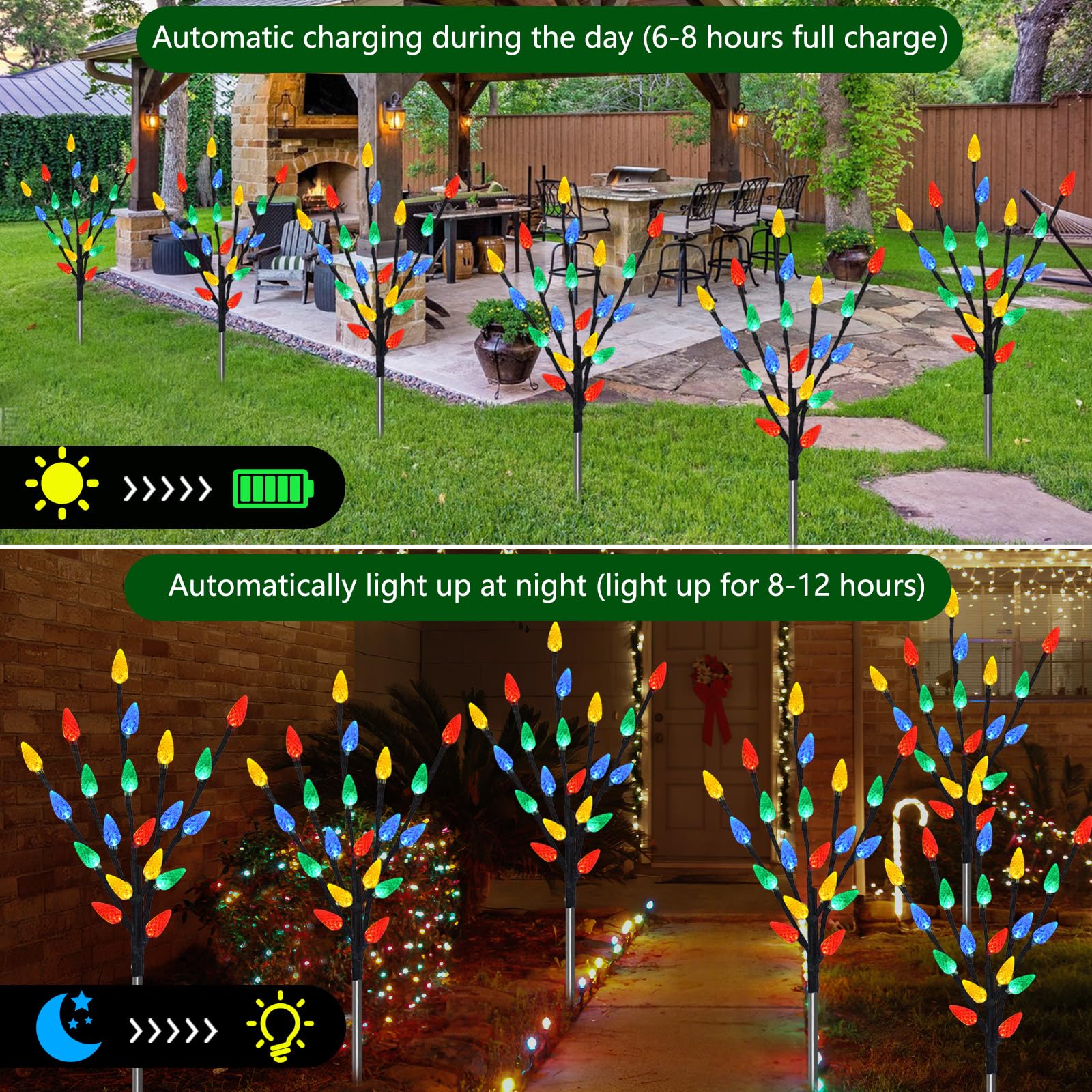 - Solar Powered C6 Christmas Lights: Powered By Solar Energy, No Bill, No Plug, Automatically Work, Charge During Daytime, Light Up at Night. Upgraded Solar Panel, 6-8 Hours Charging Time, Lasting for 8-12 Hours When Fully Charged. Energy-saving Solar Christmas Decorations